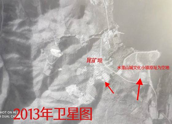 上图为2013年卫星图显示《水墨山城文化小镇》项目所在地为空地,“华鑫矿业”的尾矿库存在。
